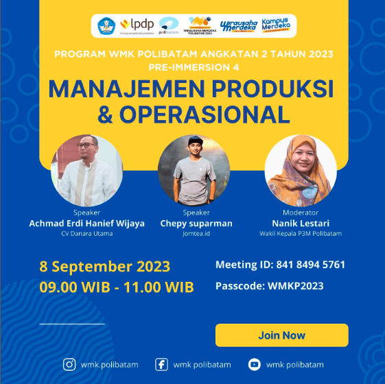 Seminar Online WMK Polibatam dengan Tema Manajemen Produksi dan Operasional (Pre-Immersion 4)